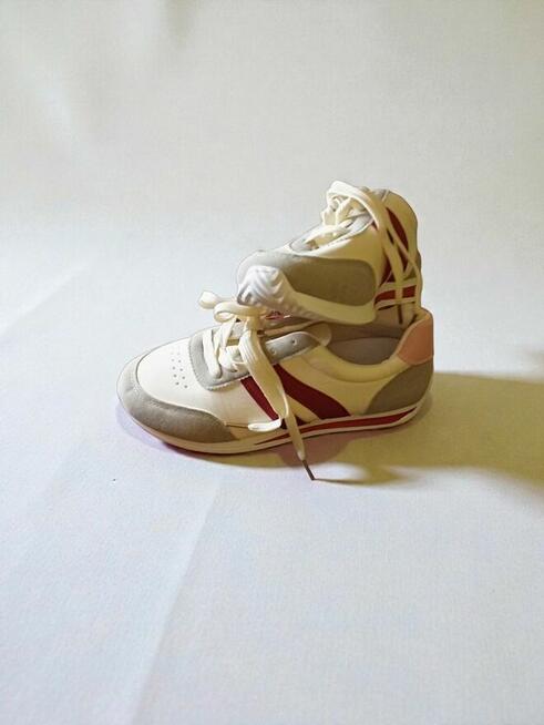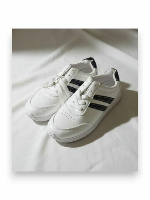 Nowe sneakersy, białe z granatowymi paskami. Rozmiar z metki: 38, ale wypadają na 37 — są delikatnie mniejsze (mniejsza ...